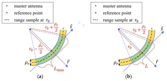 The transformation relation between the approximate form of the planar wavefront model and the spherical wavefront model is more difficult. Here we define a new coordination system named the baseline coordinate system, as shown in Figure 6 by the red solid line. The origin is the position of the master antenna, the abscissa axis denoted as is the direction normal to the baseline direction, and the vertical axis denoted as is the baseline direction. It is worth noting that it is based on the assumption that the antennas are collinear. Then, we represent the ordinate of the scatterer and the reference point as and , respectively.