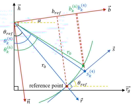where and denote the ground range and height of the scatterer. is the off-nadir angle of the reference LOS. and denote the ground range and height of the reference point, and can be expressed as