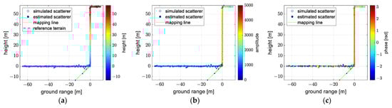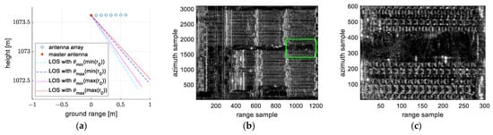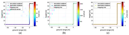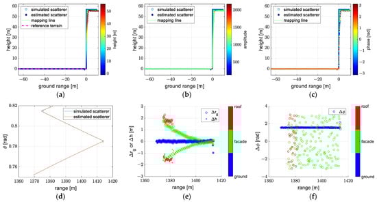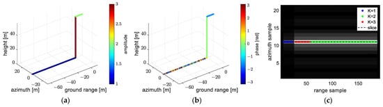 We simulated eight 2-D SAR images corresponding to different trajectories, which are isometry and coplanar. The configuration of the antenna array and the structure of the simulated scene are shown in Figure 7. The scene is composed of a ground at 0 m height, a vertical façade at 0 m ground range and a roof at 57.0524 m height, resulting in layover areas with different sparsity in the SAR images. The reference terrain is a 0 m ground plane, which can be used in models 1, 2, 3, 4 and 6. More details about the system configuration and the illuminated scene are listed in Table 2.