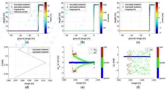 In order to see the ground range and height of the scatterer in each pixel, the 2-D image is colored to refer to ground range and height as shown in Figure 25. White color means that the scatterers in this pixel are filtered out. When there is more than one scatterer in the pixel, the highest scatterer remained. In Figure 25a, pixels in façades at the same azimuth position are in the same color, which means that scatterers in these pixels have the same ground range. In Figure 25b, pixels in an area between two facades are in the same color, which means that scatterers in these pixels have the same height. This is consistent with the fact that the façade is vertical and the ground is horizontal.