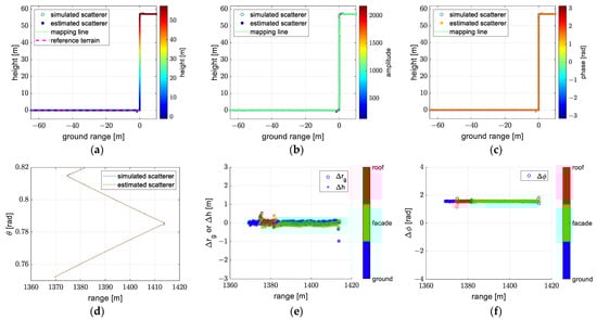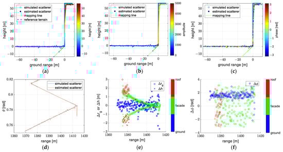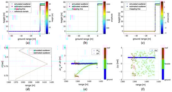 The reconstruction obtained under model 1 (the exact form of the planar wavefront model) in experiment 2: (a) reconstruction with colors denoted as height, (b) reconstruction with colors denoted as amplitude, (c) reconstruction with colors denoted as phase, (d) the off-nadir angle of the reconstruction, (e) the error of the ground range and height, (f) the error of the phase.