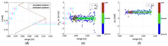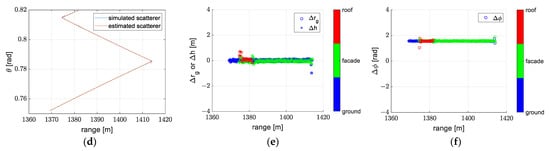 Although there are errors on geodetic coordinates of scatterers produced by the exact form of the planar wavefront model as shown in Section 3.1.3, the off-nadir angle of estimated scatterers is nearly accurate. This also confirms that the tomography processing is sensitive to the off-nadir angle of the scatterer but cannot distinguish the offset of the scatterer in the range direction. It is easy to see that we keep the off-nadir angle obtained by the exact form of the planar wavefront model and abandon the geodetic coordinate transformation method corresponding to this model, but use the geodetic coordinate transformation method (13) corresponding to the spherical wavefront model. Then, the transformed ground range and height of the scatterer are