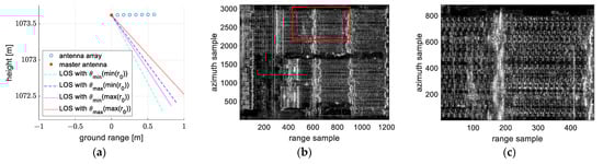 where and are the minimum and maximum off-nadir angles of the illuminated scene at slant range , respectively. is the reflectivity function related to the off-nadir angle in th model, and is the distance between the th antenna and the scatterer with off-nadir angle in th model.