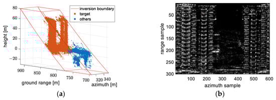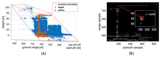 Firstly, the scene is reconstructed using model 5 as shown in Figure 24a. The reconstruction has been filtered to some extent. There are still some outliers caused by multiple scattering in the near end of the scene in the ground range direction. These outliers are not our experimental target. We extract the target by selecting scatterers that appear in a specific range of ground range, and the extracted result is projected in a 2-D image as shown in Figure 24b.