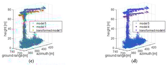 The reconstructed tower crane (a) under model 1 (the exact form of the planar wavefront model), 4 (the third approximate form of the planar wavefront model), 5 (the exact form of the spherical wavefront model) and 6 (the approximate form of the spherical wavefront model); (b) in the ground range–height plane; (c) under model 1, transformed model 1 and model 5; (d) under model 4, transformed model 4 and model 5.