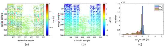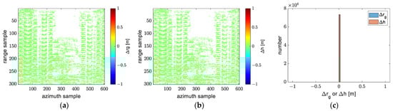 The ground range and height error between model 6 and model 5: (a) the ground range error; (b) the height error; (c) a histogram of the ground range and height error.