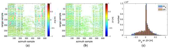 The ground range and height error between transformed model 4 and model 5: (a) the ground range error; (b) the height error; (c) a histogram of the ground range and height error.