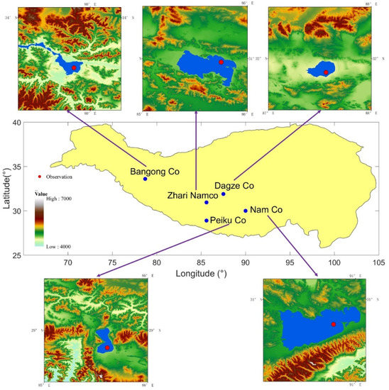 The contrasting properties between the lake and land surfaces (e.g., their surface albedo, heat capacity and roughness length) can cause local air circulations that affect the local climate [1,2,3,4,5]. In particular, lake surface evaporation after the onset of the dry and cold season can increase greatly, causing heavy rainfall or snow downwind of large lakes at high latitudes and high elevations [2,6,7]. Therefore, lake–atmosphere interactions are included in the land surface schemes used in high-resolution weather/climate modeling [1,8,9,10,11,12,13]. The lake surface water temperature (LSWT) is a crucial parameter in calculating evaporation and sensible heat flux at the lake–air interface [14,15,16,17,18]. In addition, LSWT is widely used in lake biology and climate change studies [19,20]. However, in-situ LSWT data are often not available in remote regions such as the Tibetan Plateau.