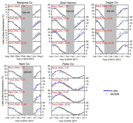 The MODIS LSWT is the lake skin temperature, whereas the in-situ data represent the bulk temperature of the mixed layer of the lakes. The MODIS LSWT was evaluated for the open-water period of a full year. When lakes were frozen (usually from January to April in large Tibetan lakes), the MODIS retrieved the ice surface temperature while the in-situ data were obtained from the subsurface water layer, so they are not comparable. Four lakes (Bangong Co, Zhari Namco, Dagze Co and Nam Co) had ice cover during the study year, and the other one (Peiku Co) remained ice-free. The ice-covered period in the four lakes can be identified with the MODIS LSWT consequent of most of the satellite data being missing when the lake was ice-covered [68].