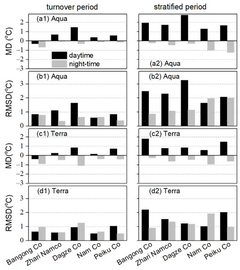 In the daytime of the lake stratified period, the RMSD may exceed 3 °C and is larger than that at night, so our focus is the discrepancy between the MODIS retrievals and in-situ measurement in the daytime. As shown in Figure 3a2,c2, the daytime MODIS LSWT from both Aqua/Terra platforms is clearly higher than the in-situ data, as indicated by the positive MD. There are two causes for the larger errors in the daytime.