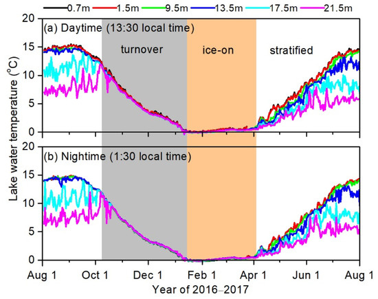 The first is the strong solar radiation in the TP. The solar heating at midday reaches its diurnal peak with a magnitude greater than 1000 Wm−2 [45,73]. According to the observations [74,75], the water clarity of lakes on the TP, as defined by the Secchi depth, is high: the mean is about 5 m. Therefore, most of these lakes are relatively transparent, allowing solar radiation to penetrate into deep layers. Solar radiation exponentially attenuates with water depth, which makes a large proportion of solar energy, particularly in the near-infrared band, be absorbed by the upper-most thin layer during the summer. However, as shown in Figure 4, there is a strong thermal stratification. This causes a much higher daytime MODIS LSWT than the subsurface temperature at the Aqua daytime overpass time (13:30 local time). As shown in Figure 3a2,c2, the daytime MD in Aqua is larger than 1.5 °C while in Terra it ranges between 0.6 °C and 1.8 °C.