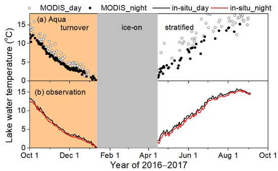 Time series of (a) MODIS retrievals and (b) in-situ data in the daytime and nighttime for Lake Zhari Namco in the year of 2016–2017.