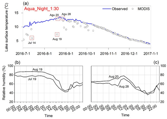 Comparison of MODIS Aqua and in-situ measurements of nighttime LSWT on Lake Peiku Co, (located in Himalaya region) (a), the diurnal variation in relative humidity on 14 July 2016 and 29 August 2016 (b) and 20 August 2016 and 28 August 2016 (c). On these two days in panel (b), MODIS LSWTs showed large negative deviations from the in-situ measurements, and the opposite in panel (c), indicated by the four red rectangles in part (a).