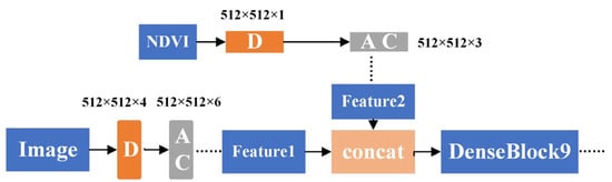 In fact, when the deep learning network learns the feature information between near-infrared and infrared bands hidden in remote sensing images, many accurate samples are required. However, it is difficult to obtain many accurate samples in practice. In our proposed DSLN, we did not take advantage of the direct fusion of NDVI because the spectral reflectance of remote sensing images is inconsistent with the NDVI dimension. The NDVI value ranges from −1 to 1, and the spectral reflectance value of the image is much higher than the value range of NDVI. If direct splicing and fusion are used, the NDVI value will be too small, and the NDVI features will be directly ignored when training the model, resulting in the phenomenon of invalid fusion. As shown in Figure 2, the NDVI fusion module integrates the NDVI information with the extracted spectral, spectral space and context semantic information mainly through convolution processing. The two complement each other’s advantages and achieve better LCC results. Considering that the NDVI fusion module is placed at the front end to extract feature information, it will result in a large loss of information, weaken the model effect, and require a large amount of computation. We set the NDVI fusion module in the ninth DenseBlock layer of the decoding layer. The NDVI fusion module preliminarily extracts the space and feature information existing in NDVI data by using coordinate convolution and a 7 × 7 convolution and then enters the concat layer and the transition down process in the network encoding structure and the obtained spectral feature information fusion. We input the feature information obtained by the NDVI fusion module into the 9th DenseBlock for convolution to obtain more effective NDVI feature information. Based on the NDVI fusion module, we realized that NDVI feature information plays an active auxiliary role in the improvement of the existing problems of LCC and an improvement in the overall accuracy.