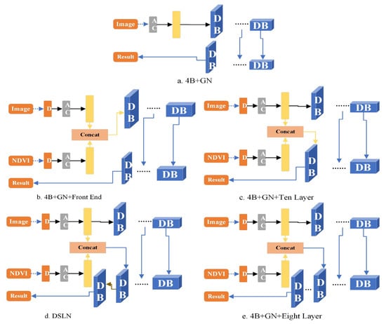 To better highlight the different roles of the NDVI fusion and utilization method in the network, we used the network without NDVI as the baseline, which is called “4B+GN” (4B is the four bands of GF-1 remote sensing image). The network where NDVI is integrated and utilized in the front end is called”4B+GN+Front End”. The network used by NDVI fusion at the end is called the “4B+GN+Ten Layer”. The network that integrates NDVI at the ninth DenseBlock layer is called “DSLN”. The network that integrates NDVI in the eighth DenseBlock layer is called the “4B+GN+Eight Layer”. Their structures are shown in Figure 4. In addition, to better highlight the impact of network structure adjustment, we conducted experimental comparisons on the network adjustment to discuss and analyze the effect of the normalization method and NDVI fusion method on the overall multi-classification effect. The test results based on the same image dataset are shown in Table 5.