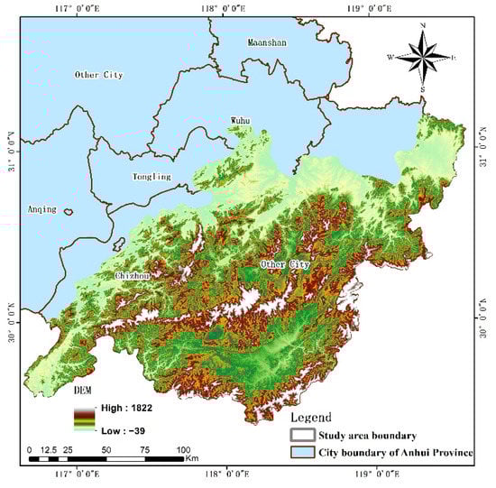 SAHMHER is located at 116°38′–119°38′E and 29°23′–31°12′N (Figure 6), with an area of 2.76 × 104 km2, accounting for 19.7% of the provincial area. SAHMHER has a subtropical humid monsoon climate with abundant precipitation, the average annual temperature is 15.4–16.3 °C, the average annual precipitation is 1200–1700 mm, and the average annual evaporation is 1200~1400 mm. The topography is dominated by the Huangshan Mountains and the Tianmu Mountains and their surrounding low mountains and hills. The vegetation zone is mainly subtropical evergreen broad-leaved forest, and in the hilly areas, it is mainly mixed forest of evergreen and deciduous broad-leaved forest. Among the forestland cover types, coniferous forest is widely distributed. It is the most popular tourist resource in Anhui Province. National and provincial nature reserves and forest parks are all over the place, making it one of the hotspots for biodiversity conservation in Anhui Province and even China.