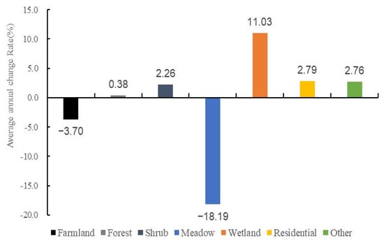 The area and ESV of major land cover types in SAHMHER in 2015 and 2020 are shown in Table 6. The average annual rate of change of the area of different land cover types is shown in Figure 7. During the five years, the forest, wetland, residential, shrub, and other land cover areas show an increasing trend, with average annual change rates of 0.38%, 11.03%, 2.79%, 2.26%, and 2.76%, respectively. The land coverage area of farmland and meadow show a decreasing trend, with average annual change rates of 3.70% and 18.19%, respectively.