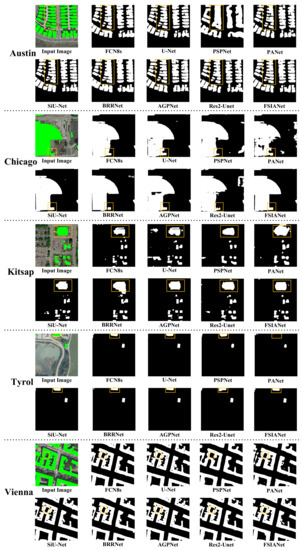 We perform all the experiments with a total of 180 aerial image tiles covering an area of 405 km2 for the Inria Aerial Image Dataset [18]. It contains a total of five sub-datasets, namely Austin, Chicago, Kitsap, Tyrol, and Vienna, each of which consists of 36 aerial image tiles. We take the first 25 aerial image tiles and the remaining 11 aerial image tiles in each sub-dataset as a training set and a testing set, respectively. Consistent with [19,66], we crop all the aerial images to a size of pixels. Therefore, the training and test sets in each sub-dataset consist of 2025 and 891 aerial images, respectively. The Inria Aerial Image Dataset was collected at different times and places. It is a very challenging task to accurately extract buildings with huge differences in architectural style, structure, and distribution in each place.