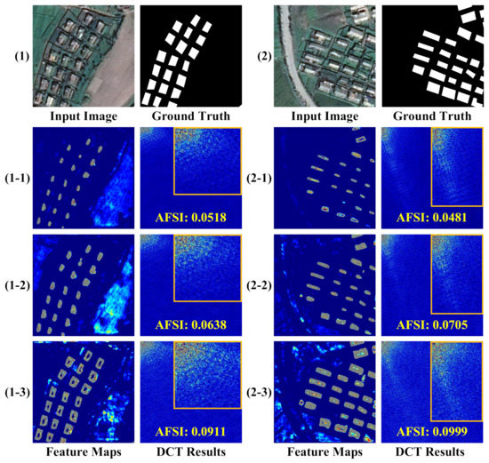 Furthermore, to illustrate the rationale for the FSIANet design, the feature maps and discrete cosine transformation (DCT) results on the East Asia Dataset are shown in Figure 7. Here, we define an average frequency spectrum intensity (AFSI), which is the average of the frequency spectral values (computed by DCT) of a feature map. For AFSI, a higher value of AFSI means that building semantic and spatial information is more closely connected. Figure 7 mainly illustrates the visualization of the DCT in three channels of the feature map obtained from FSIANet. For example, in Figure 7(1-1–1-3), the more information the feature map carries, the bigger the corresponding AFSI is. This intuitively illustrates that FSIA can emphasize features with high response to building semantic features at each scale, and weakening features with low response will enhance the representation of building features.