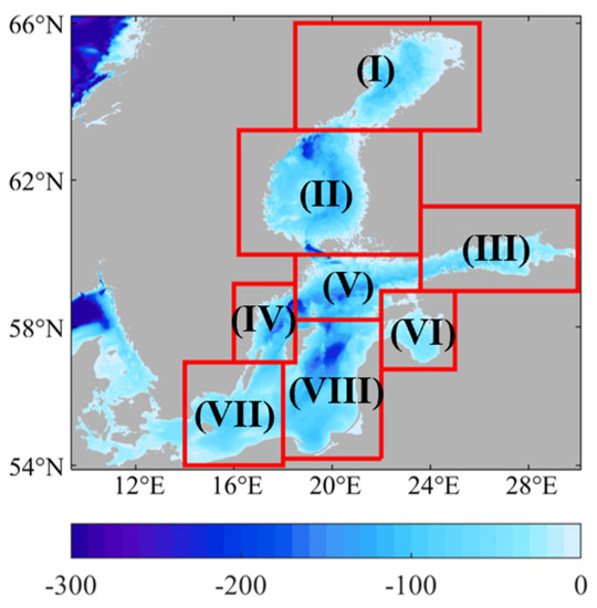 The density map (Figure 1d) shows that in situ SSS measurements covered most areas of the Baltic Sea. To eliminate the under-sampling areas, only grids with more than 10 collocated SSS pairs were selected for statistical calculations. The topography and subregions divided in the Baltic Sea are given in Figure 2.
