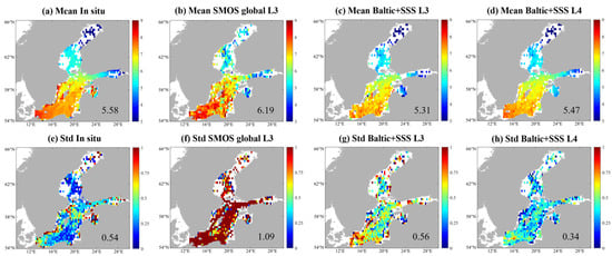 Mean SSS field in the Baltic Sea averaged from collocated (a) multi-source in situ salinity measurements. (b) BEC global L3 product, (c) Baltic+SSS L3 product and (d) Baltic+SSS L4 product on a consistent 0.25°×0.25° grid. The lower panels show the corresponding STD values of the collocated (e) multi-source in situ SSS measurements and (f) BEC global L3 product, (g) Baltic+SSS L3 product and (h) Baltic+SSS L4 product. The numbers labeled in the lowest right are the spatial average SSS values. The unit is in PSU.