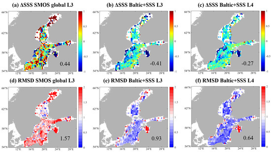Figure 4 shows the corresponding spatial distribution of ΔSSS and RMSD between three SMOS products and in situ measurements. The overall negative ΔSSS values were synchronously seen from both the Baltic+SSS L3 and L4 products, with the smaller ΔSSS and RMSDs belonging to the L4 product. Large ΔSSS and RMSD values were mainly distributed near the coast and in the gulfs, such as in the northern part of the Bay of Bothnia, in the Gulf of Riga and in the West Gotland Basin. In comparison, the global L3 products contained significantly larger positive biases, especially in the Bay of Bothnia, the East Gotland Basin, the North Baltic Proper and the Gulf of Riga, where several RMSD values reached as large as 2 PSU. Overall, the Baltic+SSS L4 product was closest to the in situ measurements in terms of mean fields and variances, as also supported by the smallest biases and RMSD values against collocated in situ SSS data.