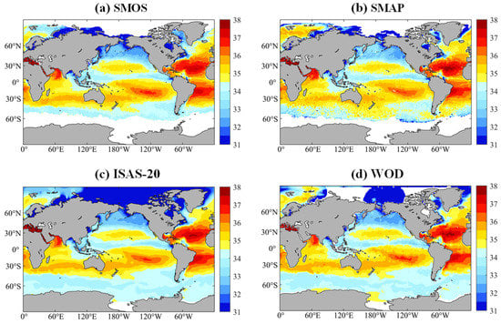 Global SSS maps for (a) Soil Moisture and Ocean Salinity (SMOS), (b) Soil Moisture Active-Passive (SMAP), (c) In Situ Analysis System (ISAS-20) and (d) WODSSS in August 2017. The unit is in the Practical Salinity Unit.