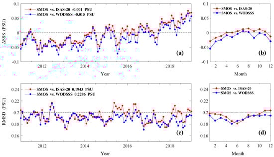 The long-term monthly (a,c) and seasonal (b,d) time series of ΔSSS (a,b) and RMSD (c,d) with respect to WODSSS and ISAS-20 data between 60°S and 60°N after excluding areas of excessive deviations.