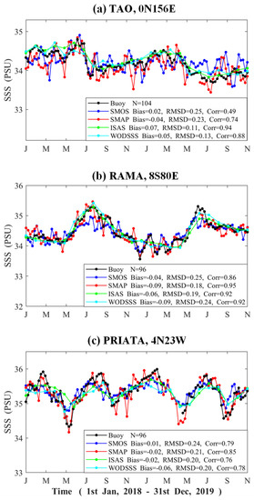 Tropical moored buoys from the Global Tropical Moored Buoy Array (GTMBA) provide daily SSS measurements at fixed locations. These long-term daily sampling data are valuable for validation of SMOS data between the weekly scale and the interannual scale. The weekly time series of SMOS L3 product and in situ gridded SSS data at each buoy locations were selected using the nearest grid in the 0.25° × 0.25° boxes after applying a 7-day average filtering. As an example, Figure 11 shows the time series of 3 representative buoys in GTMBA arrays with more than 90 matched weekly samples. Results showed that SMOS and SMAP were consistent at weekly scales and provided salinity variations very similar to the buoys. It is noted that not only the flat trends correspond well, but also the rapid fluctuations of salinity at the buoy locations can be well captured by SMOS and SMAP data. A typical example was the rapid decrease of approximately 1.5 PSU occurring from 15 May 2018 at 4°N, 23°W. However, despite the fact that WODSSS and ISAS-20 data could generally corroborate the SMAP and SMOS SSS at monthly scale, they failed to catch the fluctuations with time scales shorter than 2 months limited by the time resolutions. Additionally, very small deviations were found between WODSSS and ISAS-20, which was attributed to the usage of similar OI algorithm and the abundant in situ observations merged into the models. The similarities between SMOS and tropical buoy SSS data proved that SMOS is capable of tracking salinity variations at weekly scale.