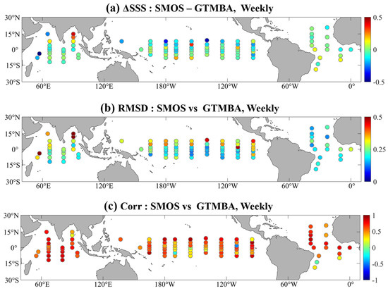 Comparison of SMOS SSS with salinity measured by GTMBA buoys at 1 m depth at weekly scale in terms of (a) ΔSSS, (b) STD and (c) correlation coefficient. The time range was from 1 January 2018 to 31 December 2019.