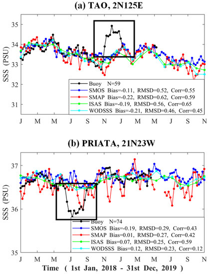 There are several buoys where we found large ΔSSS, RMSD and a low correlation coefficient with the collocated salinity data from both satellite and in situ products. Two typical examples are shown in Figure 15. For the TAO buoy located at 2°N, 125°E, the buoy salinity became progressively higher during November 2018 to February 2019, whereas the SMOS and SMAP SSS were in good agreement with each other and conformed to the collocated salinity data from WODSSS and ISAS-20. Another example is the PIRATA buoy at the location 21°N, 23°W, where the SSS value suddenly dropped by 0.5 PSU from June to July in the year of 2018 but the satellite SSS varied in a flat trend that coincided with the collocated salinity from WODSSS and ISAS-20. Given that the average value and the fundamental variation trend were not significantly different with satellite data, one probable explanation for the abnormal buoy data is a temporal malfunction of the mooring salinity sensor. This indicates that satellite data can be used to flag in situ observations for further consideration of possible instrument error after excluding all suspicious buoys with large drifts. However, this does not mean that buoy salinity cannot serve as ground truth since in most circumstances, the buoy SSS conformed to both the satellite SSS and the in situ analyzed SSS, and the large drifts contained in buoy SSS time series are significant enough and easy to be identified by a comparison with satellite SSS, as shown in the two samples given in Figure 15.