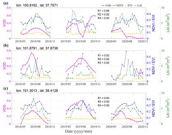 Time-series of VOD and VIs at three sampling points: (a) site a, (b) site b, (c) site c. (their locations are shown in Figure 1). Note: R1, R2, R3 are the correlations computed between VOD and NDVI, EVI and LAI, respectively.