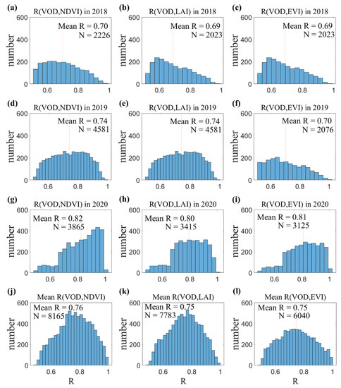Histograms of temporal correlation coefficient (R) between VOD (from top to bottom: VOD in 2018 (a–c), VOD in 2019 (d–f), VOD in 2020 (g–i), the three yearly average VOD (j–l)) and three MODIS VIs (from left to right: NDVI, LAI, EVI). The red vertical line represents the mean value of R for each year.