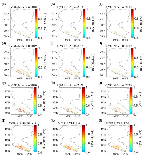 The correlation coefficient (R) between VOD (from top to bottom: VOD in 2018 (a–c), VOD in 2019 (d–f), VOD in 2020 (g–i), the three yearly average VOD (j–l)) and three MODIS VIs (from left to right: NDVI, LAI, EVI).