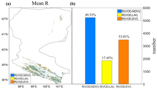 Map showing the highest absolute temporal correlation (R) values between MODIS VIs and VOD (a) and the percentage of pixels over the study regions (b).