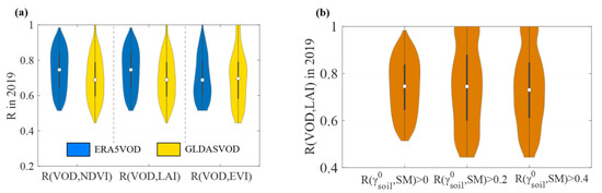 Thus, four SM products (e.g., SMAP-L3 [54], SMOS-IC [55], GLDAS, ERA5 SM) as inputs in the soil model (Equation (9)) were tested in our proposed algorithm to better understand the impact of SM accuracy on the VOD retrievals, but the results are only shown for GLDAS and ERA5 SM, because SMOS and SMAP retrievals are hampered by complex topography in this region (as brightness temperatures measured by radiometers are flagged/discarded in the presence of topography due to the strong influence of this parameter on microwave radiation). Figure 12a displays the correlation between VIs (NDVI, LAI, EVI) and VOD retrievals using two SM products (from GLDAS and ERA5) for the year 2019, respectively. VOD retrieved by ERA5 (ERA5VOD) shows the best performance (mean R = 0.74, 0.74, 0.70 for NDVI, LAI, EVI, respectively), followed by VOD retrieved by GLDAS (GLDASVOD) (mean R = 0.69, 0.69, 0.70 for NDVI, LAI, EVI, respectively), confirming that SM is important for retrieving VOD in our algorithm.