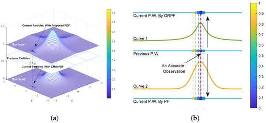 To clearly illustrate the roles of the pdfs in Equation (10) compared with that in Equation (11), we provide slice plots of the pdfs the along y-axis. It is observed that the plot of the sharper pdf in the proposed method would encourage the contributions from the reliable particle, and it would weaken the particle weight concerning these unreliable particles, shown in the top plot in Figure 2b. It is found that the blue particle ball has a higher weight due to its high reliability in the current time step, whereas the yellow one has a lower weight in the proposed model compared with those in the bottom pdf of the CMSt. In conclusion, the proposed method encourages the contributions from the particle weights of reliable particles and weakens the contributions from the unreliable particles by discriminatively treating the observed vector data. This could be the reason why the proposed method is more robust to outliers and acquires improved state estimates compared with the CMSt method.
