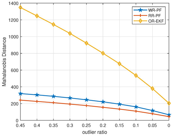 The performance results versus outlier ratios are also examined in Figure 5, the proposed method has the lowest Mahalanobis distance across all ratios, and thus has better performance than those in the WR-PF and OR-EKF methods. Note that the results in the PF method are not provided due to quite a sensitivity to outliers, yielding significantly poor performances.