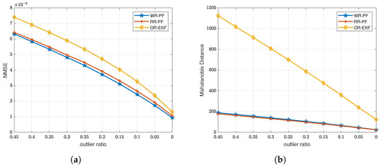 Then, we consider only azimuth outliers in the multidimensional measurements, and the other two entries are normal values. The proposed method has the lowest estimated NMSE in both average Mahalanobis distance and NMSE compared with those in the OR-EKF and WR-PF methods, shown in Figure 7. Finally, Figure 8 shows the performance comparisons between the proposed method and the other two robust solutions in the only velocity outliers case, and it is observed that the proposed method has clear performance improvements and has the lowest NMSE and average Mahalanobis distance across normal measurement ratios.