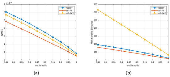 In the following simulations, diverse types of outliers in the multidimensional measurements are considered to examine the performances of the proposed method. First, we consider only range outliers in the multidimensional measurements, that is to say, the azimuth and velocity entries are abnormal values with . It is found that both PF-based methods have better performances than that in the KF-based method, shown in Figure 6. The main reason may be the nonlinear approximation in the measurement function in the EKF method. These two PF-based outlier-robust methods can effectively address the range outlier issue and acquire comparable NMSEs, even though the NMSEs in the WR-PF method are a little bit smaller than those in the proposed method in the target location estimation, shown in Figure 6a. The possible reason could be that the entry of range is much larger than the other two entries in the multidimensional measurements, and thus the scalar weight in the WR-PF method is learned and estimated to accurately model the measurement noise variances, particularly in the noise variance of the range entry in the multidimensional measurements, such that the lower NMSEs in the target locations can be obtained. However, to evaluate the performance of the entire estimated state-space vector in the filtering methods, the proposed method has the lowest average Mahalanobis distance across outlier ratios, shown in Figure 6b. Therefore, it suggests that the proposed method has better estimation performances in the entire state-space vector estimation by treating the weights associated with each entry in the measurement vector data probabilistically.