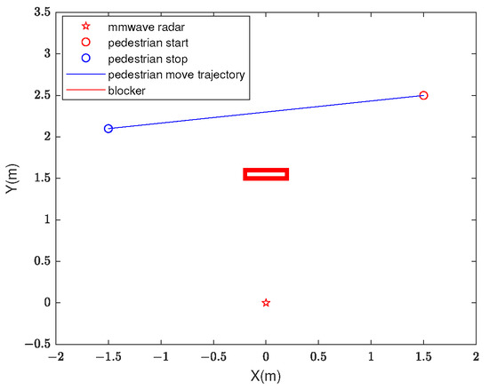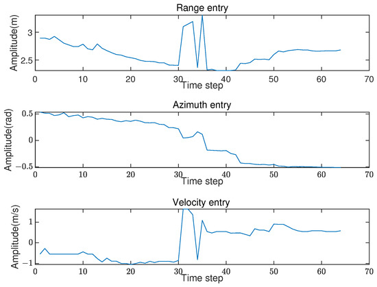 In this subsection, real data collected by the automotive millimeter wave (MMW) radar with linear modulated continuous waveform (LFMCW) are used to verify the algorithm’s effectiveness. In the automotive radar application, pedestrian tracking based on the MMW radar is often an issue of great importance. Therefore, we consider pedestrian tracking in these experiments. A 77 GHz millimeter wave radar, whose parameters are shown in Table 2, is used to carry out experiments. An LFMCW waveform with a bandwidth of 4 GHz is used for the high range resolution of 0.0375 m, and the sampling rate of 6.25 MHz is used to acquire raw data. Two-dimensional (2D) Fourier Transform (FT) is firstly implemented on the raw data, and thus the constant false alarm ratio (CFAR) technique is used to acquire the estimates of the range and velocity of the walking pedestrian. Finally, the digital beamforming technique is utilized to obtain the azimuth of the pedestrian. To this end, the measurement vector is acquired for further target tracking. During the data collection of the pedestrian, several artificial blocks are place along the tracking path, and then some outlier measurements occur in the acquired measurement vector.