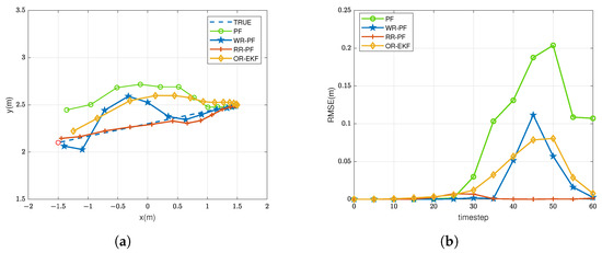 To further illustrate the estimation performance of the algorithm, we provide the Cramer–Rao Bound for the nonlinear system to serve as the reference for the estimation error. We present the universal MC-PCRB method above for discrete-time state-space models to solve the iterative Cramer–Rao bound at each step in Equation (16). Figure 9 shows the comparison results among these methods. The outlier ratios are assigned to be . It is observed that the RMSEs in the outlier robust methods generally decrease with the increases in the time step, except in the conventional PF method. The proposed method is generally close to the PCRLB, and thus has the lowest RMSE. The proposed method has higher RMSEs than the WR-PF method in the early stage because of more parameters to learn. In theory, the proposed method would approach the PCRLB, as long as the number of particles approaches infinity while tracking under a stable state.
