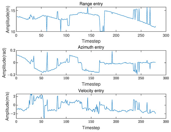 where denotes the measured range of the target at the time step k, represents the measured spatial information, and is its measured radial velocity.