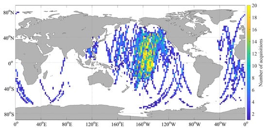 Map of the selected Gaofen-3 wave mode acquisitions during the years 2016–2020 in data density for 2° × 2° bins.