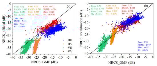 Comparison of the calibrated quad-polarization Gaofen-3 SAR NRCSs with the GMF predictions. (a) The SAR NRCSs were calibrated using the official calibration constants. (b) The SAR NRCSs were calibrated using the ocean recalibration procedure. Different colors represent different polarizations, with blue for HH, orange for HV, green for VH, and red for VV.