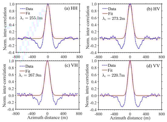 where x denotes the spatial distance in the azimuth direction. Figure 4 shows estimation of azimuth cutoff from the imagette shown in Figure 2 at polarization channels of HH, HV, VH, and VV. As seen, the values of the azimuth cutoff obtained from SAR images at different polarizations were different. The HV and VH cutoffs were larger than the HH and VV estimates. This is probably attributed to the fact that the smearing effects of cross-polarization SAR were larger for shorter coherence times [30]. The HH cutoff was slightly larger than the VV estimate. This may have been related to the larger HH-polarization modulation transfer function [30]. The azimuth cutoff estimates under HH, HV, VH, and VV configurations were considered in our models.