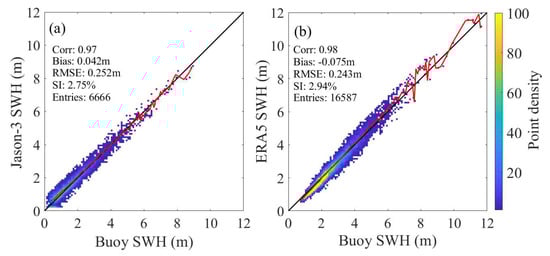(a) Scatter point density plot of Jason-3 SWH versus buoy SWH. (b) Scatter point density plot of ERA5 SWH versus buoy SWH. The black solid lines indicate the one-to-one diagonal. The red solid lines join the mean values from SAR estimates in each 0.1 m bin of buoy SWH. Colors denote the data point numbers within 0.1 m × 0.1 m bins. Jason-3 collocation was limited to 1 h and 100 km. ERA5 collocation was performed based on the time/space interpolation over the year of 2017.