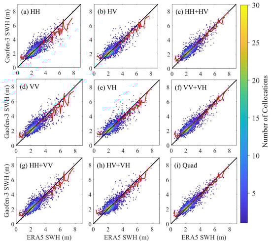 Plots of Gaofen-3 SWH retrievals from the GPR model versus ERA5 SWH for the nine polarization modes of (a) HH, (b) HV, (c) HH+HV, (d) VV, (e) VH, (f) VV+VH, (g) HH+VV, (h) HV+VH, and (i) HH+HV+VH+VV. The red solid lines join the mean values from SAR estimates in each 0.1 m bin of ERA5 SWH. Colors denote the data numbers within 0.1 m × 0.1 m bins.