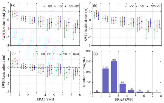 Comparison of SWH residuals against ERA5 SWH, with error bars presenting the standard deviation. The Gaofen-3 SAR SWH estimates were obtained from the GPR model under the nine polarization modes of (a) HH (green), HV (red), HH+HV (blue); (b) VV (green), VH (red), VV+VH (blue); and (c) HH+VV (green), HV+VH (red), HH+HV+VH+VV (blue). (d) Histogram of ERA5 SWH in bin size of 1 m, where the data count is labeled in black text.