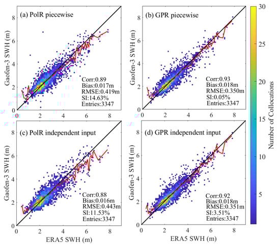 Plots of Gaofen-3 SWH retrievals from (a) the piecewise quad-polarization PolR model, (b) the piecewise quad-polarization GPR model, (c) the quad-polarization PolR model that included θ as an independent variable, (d) the quad-polarization GPR model that included θ as an independent variable against ERA5 SWH. Red lines join the mean values from SAR estimates in each 0.1 m bin of ERA5 SWH. Colors denote the data numbers within 0.1 m × 0.1 m bins.